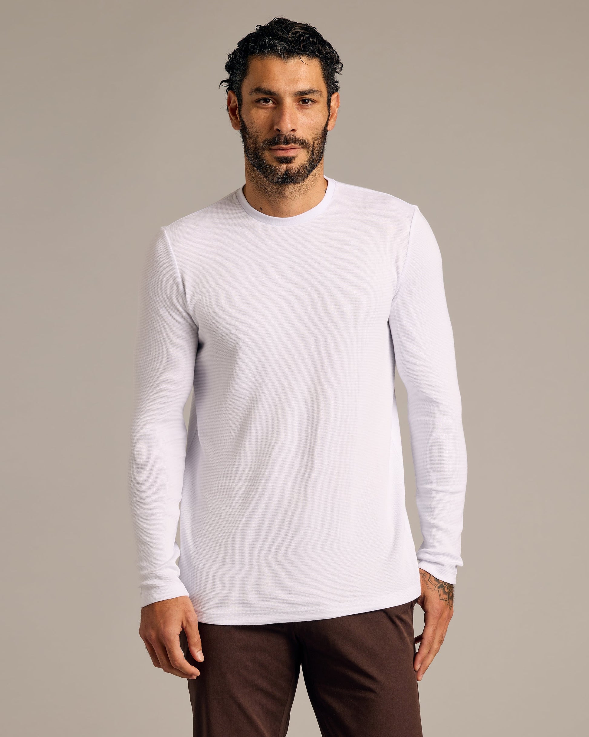 - White Waffle Long Sleeve Crew Neck
